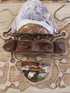 2024Wandobject met gezicht, uitgewerkt in keramiek en hout.